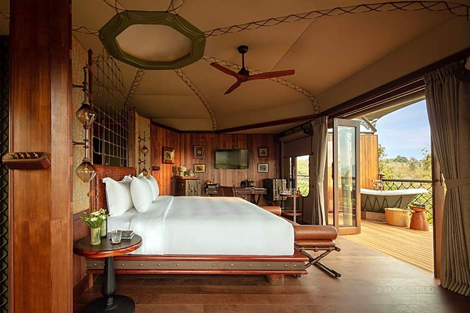 Indulge in the spacious Three Country View Family Suite with three king beds and two twin beds, offering stunning mountain, garden, and river views. Unwind in the hot tub, relax on the balcony, and enjoy the luxurious amenities during your stay.